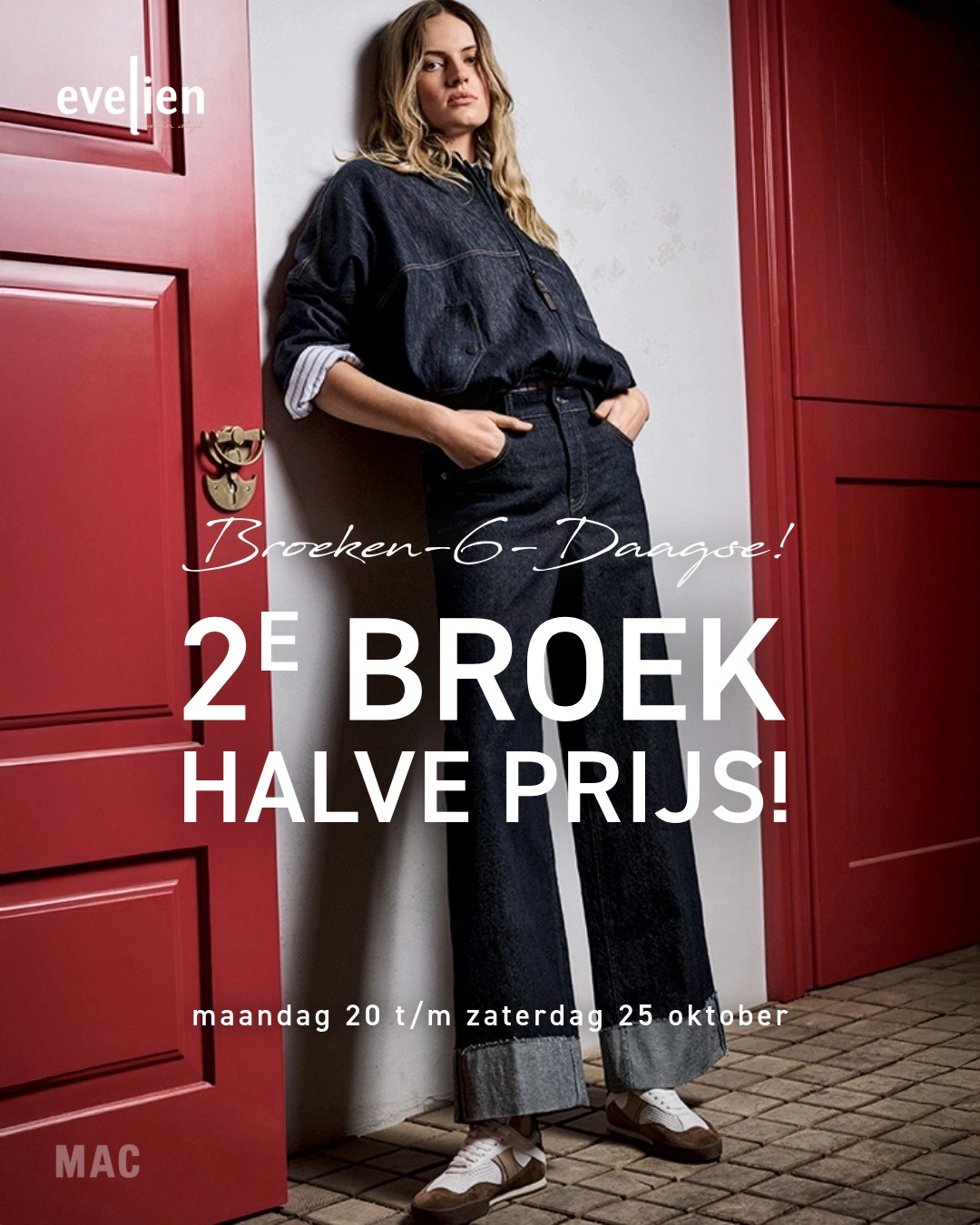 Van maandag 20 t/m zaterdag 25 oktober krijgt u de 2e BROEK VOOR DE HALVE PRIJS!